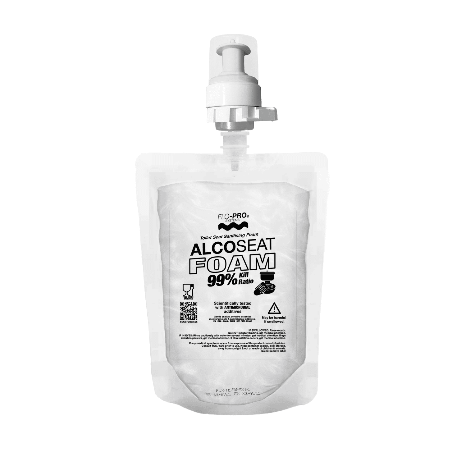Flo-Pro © Alcoseat Foam Seat Sanitiser, the ultimate solution for maintaining impeccable hygiene standards in toilets. Say goodbye to unclean toilet seats and hello to a quick and effective sanitising. A single dose of our foam seat sanitiser. Our innovative formula not only improves hygiene but also reassures users about their comfort and well-being.